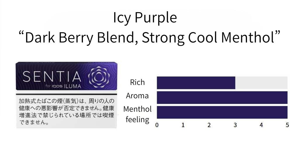 When heating and trying “Sentia Icy Purple,” a refreshingly strong menthol immediately stimulates the throat, and as the vapor is exhaled, the cooling sensation lingers together with a subtle hint of berry aroma that gently settles into the aftertaste