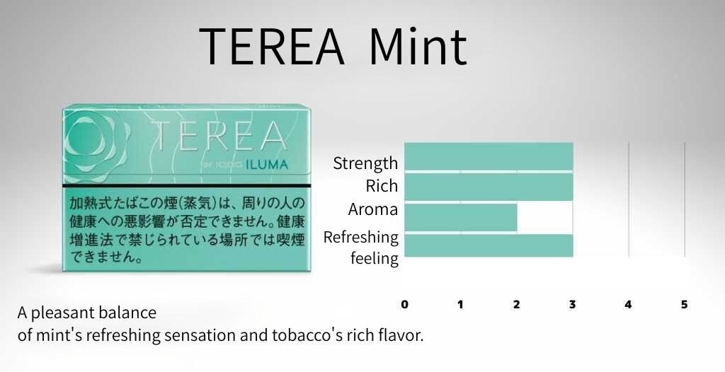 When you heat up the “Teria Mint” and take a puff, a pleasant menthol sensation and a refreshing minty touch gently hit your throat, creating a smooth and enjoyable experience.The menthol level is moderate — mild enough for those who usually avoid strong menthol, making it approachable and easy to enjoy.The mint flavor itself is well-balanced, not overwhelmingly minty, and allows a subtle sweetness and the natural taste of tobacco leaves to come through. While it’s not overly sharp or intense, it offers a wonderfully harmonious and refined flavor profile.In terms of aroma, it’s lighter and cleaner than “Teria Menthol,” making it comfortable to use even for those who are sensitive to strong scents.For users who don’t seek an intense menthol kick, this flavor provides just the right amount of tobacco presence, offering a surprisingly natural and satisfying experience.Overall, “Teria Mint” stands out as a refreshing and well-crafted alternative in today’s menthol-dominated heated tobacco market — a flavor that values balance and smoothness over sheer intensity.